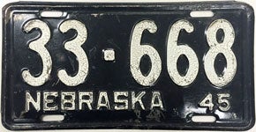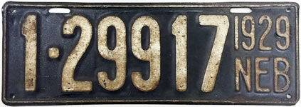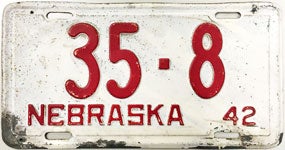 In 1940 - 1941 the Statehouse Emblem was added. Beginning with the 1956 license plates, a slogan “The Beef State” was embossed on the plates and remained until 1965. In 1966, the word “Centennial” was embossed on the plates in honor or the States Centennial Celebration in 1967 for the license plate series expiring in 1968. In 1969, the slogan “Cornhusker State” was embossed on the plate until 1975.